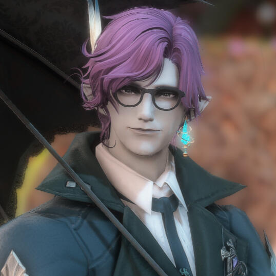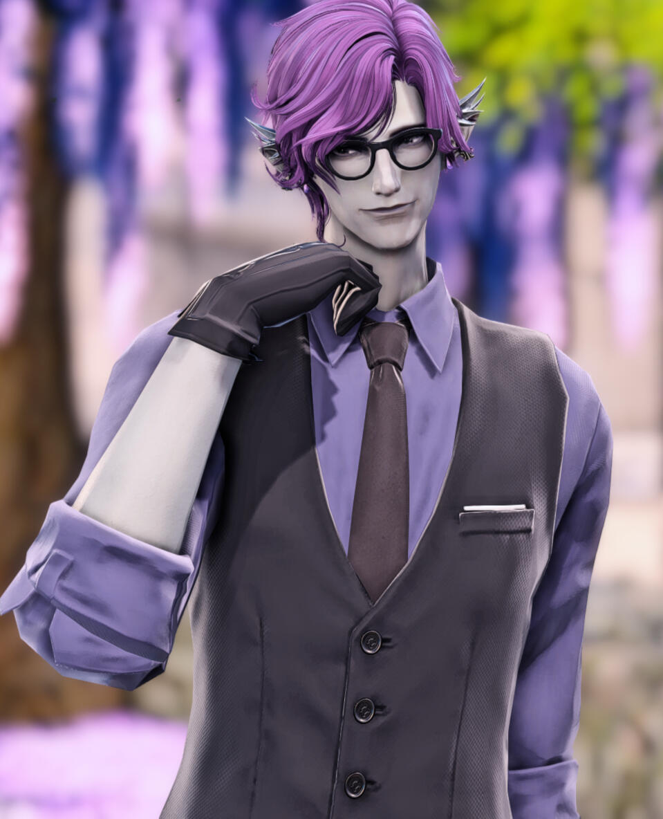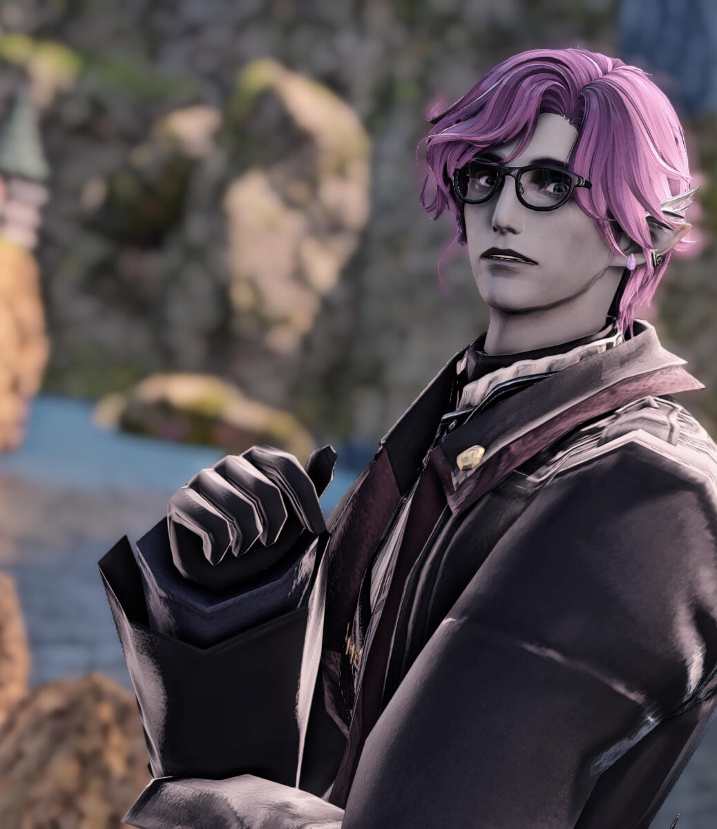 • He stands on the shorter side, with an unusually pale complexion and dark circles under his eyes. Beneath a mess of purple hair, grey eyes hide behind thick, black frames. A long scar spans the length of his left palm, and many more of varying sizes run across the top of each—hidden by gloves he never removes. Faint scars also run across his back, not noticeable at a glance. While his style tends towards suits and ties, he can occasionally be spotted in more relaxed dress.• Remiel's accent is an amalgamation of Sharlayan, Shroud, and